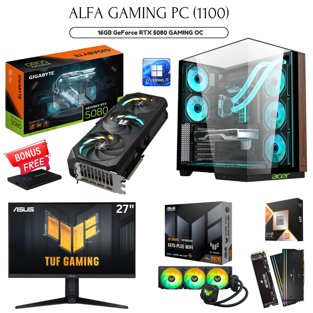 - ألفا جيمنج PC 1100 AMD 9900X3D، 16 جيجابايت RTX5080، 64 جيجابايت رام، 2 تيرابايت SSD، شاشة ASUS 27 بوصة 260Hz، Acer V333BK، ويندوز 11 برو، مكافأة مجانية