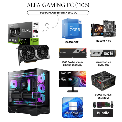 ألفا جيمينج بي سي 1106 إنتل i5-13400F، 8 جيجابايت RTX5060، 16 جيجابايت رام، 1 تيرابايت SSD، شاشة أيسر 27 بوصة 144 هرتز، حزمة، واي فاي، Huntkey MVP Destiny، ويندوز 11 برو