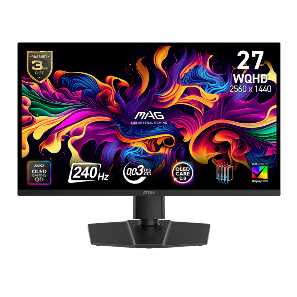- شاشة الألعاب إم إس آي MSI مقاس 27 بوصة MAG 273QP QD-OLED X24 بدقّة 2K وتردد 240 هرتز وزمن استجابة 0.03 ملّي ثانية، بمعيار HDR400 ومنفذ HDMI 2.1، مع إمكانية التدوير والضبط.